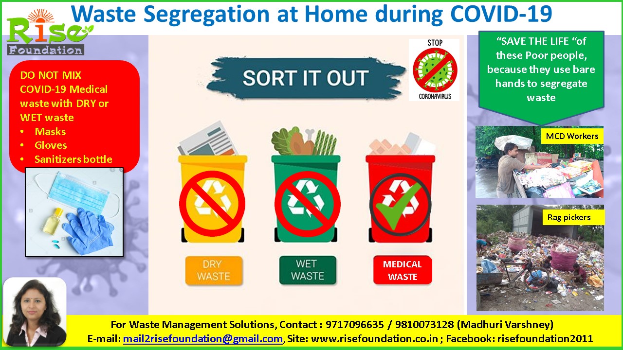 The need for implementing and ensuring segregation of waste at source is must during the coronavirus (COVID-19) outbreak in country, said by Madhuri Varshney – A social activist and Founder of RISE Foundation Social Organisation. This habit will not only reduce dumping of waste in landfills and oceans but will also play a crucial role in fighting with COVID-19.