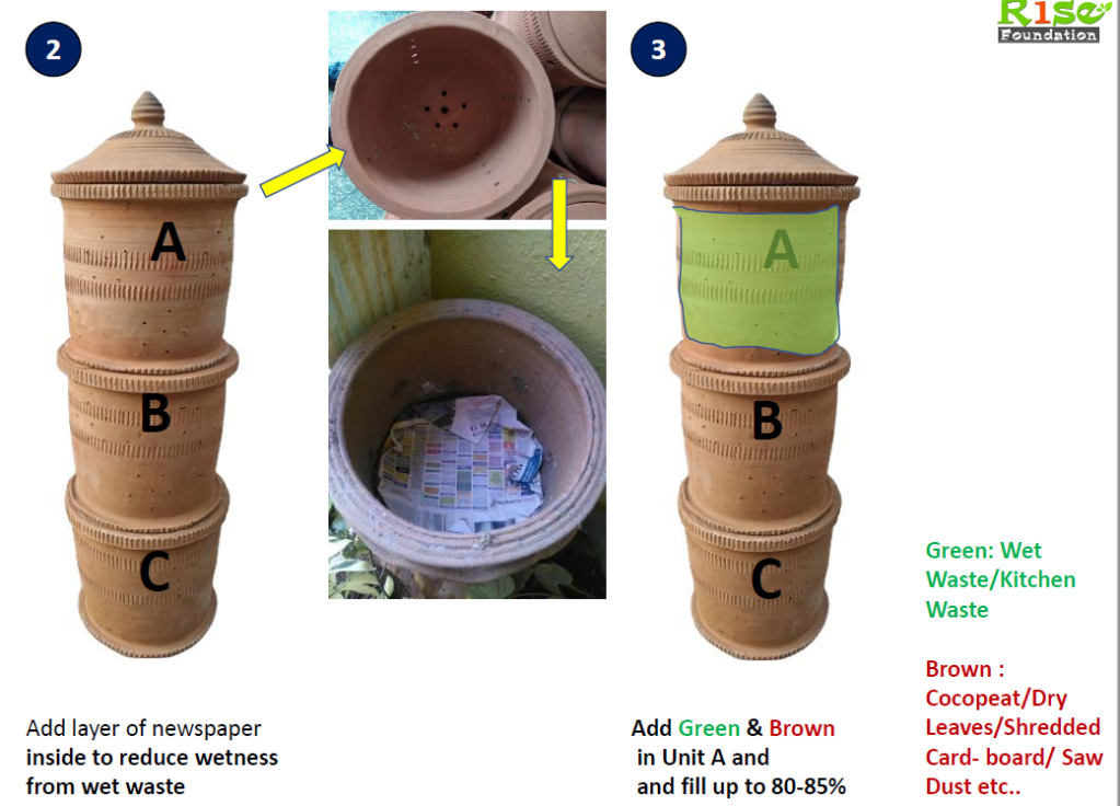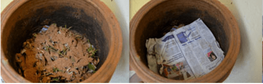 Cover it with cocopeat or saw dust or dry leaves. We will call this “Pile”. Every time you add your kitchen waste (greens), you have to cover it with cocopeat or dry leaves or saw dust (browns). Waste should not be visible. Then cover it with a newspaper (to prevent flies) and close it with a lid.