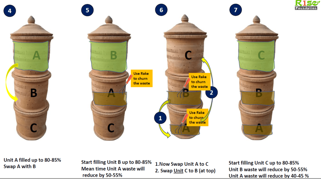 When the unit C is filled and unit A material has already passed 30 days – Compost is ready in unit A, else you need to empty the substance from Unit A to some other container to give few more days to ready Organic compost.