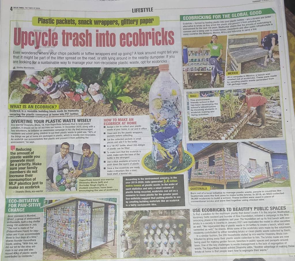 Thanks to The Times of India Delhi Times 12.08.2021 covered our Rise Foundation NGO work on ecobricks in Dwarka New Delhi (bottom right ).