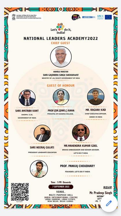 On 7th Sept 2022, Lets’ Do it India, Campaign (for clean water, water conservation and Ganga Bachao) calls all National Leaders who are either into Environment protection or somehow connected with the movement under Ministry of Jal Shakti Ministry, #UN (environment), #AIESEC