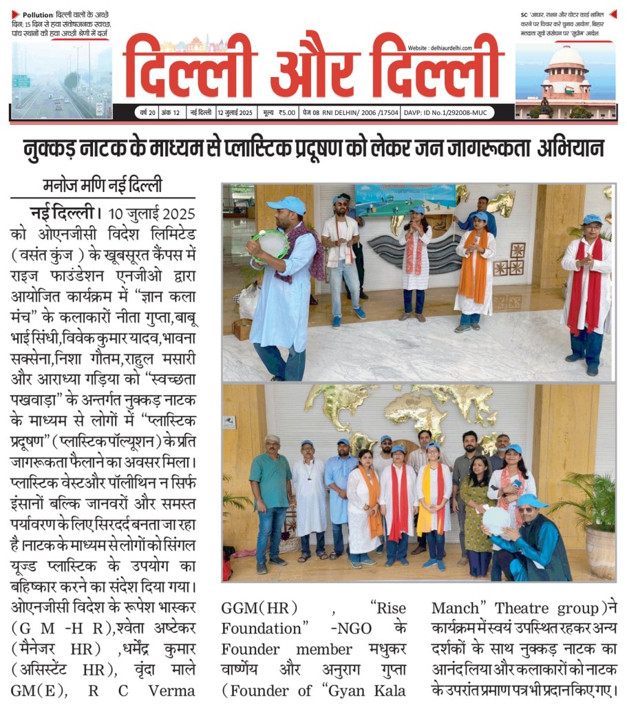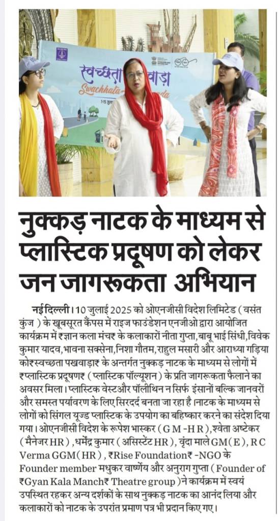 Rise Foundation, in association with ONGC Videsh, proudly organized a powerful Nukkad Natak performed by the talented team of Gyan Kala Manch to raise awareness on the pressing issue of Plastic Pollution and the urgent need to Say No to Single-Use Plastic on 10th July 2025 on occasion of Swachhata Pakhwada 2025.