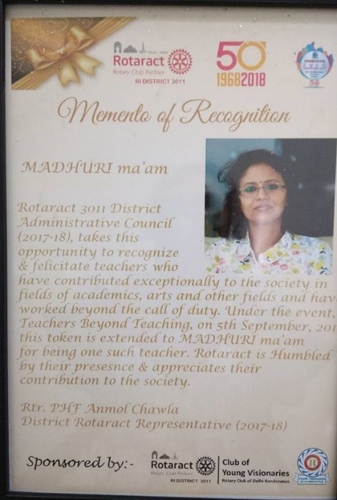 On Teacher’s day Rotaract felicitate RISE Foundation Secretary and Social Activist Ms Madhuri Varshney. She expressed her views and gratitude as follows: