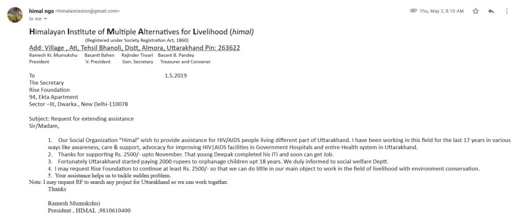 Apart from this, 4 patients have been informed in other parts of Uttarakhand i.e. Someshwar and Danya. RISE Foundation supported these patients by providing Rs 2000/- monthly to cover some of there daily expenses for 1 year. Later on Himal informed us that the Uttarakhand started paying 2000 rupees to orphanage children upto 18 years, So these children do not need financial assistance any more.